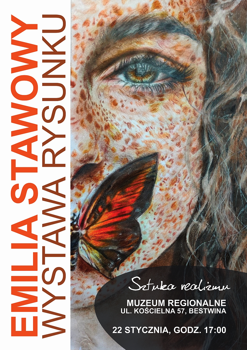 Plakat - zaproszenie na wystawę rysunku - Emilia Stawowy - Sztuka realizmu - Miejsce spotkania Muzeum Regionalne, ul. Kościelna 57, Bestwina. Data: 22 stycznia, godz. 17:00, wstęp wolny.Kliknij w plakat aby powiększyć w nowym oknie przeglądarki.